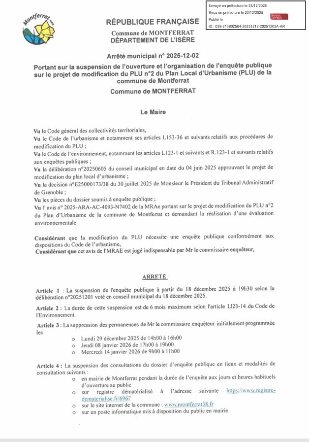 ARRÊTÉ SUSPENSION ENQUÊTE PUBLIQUE MODIFICATION PLU N°2
